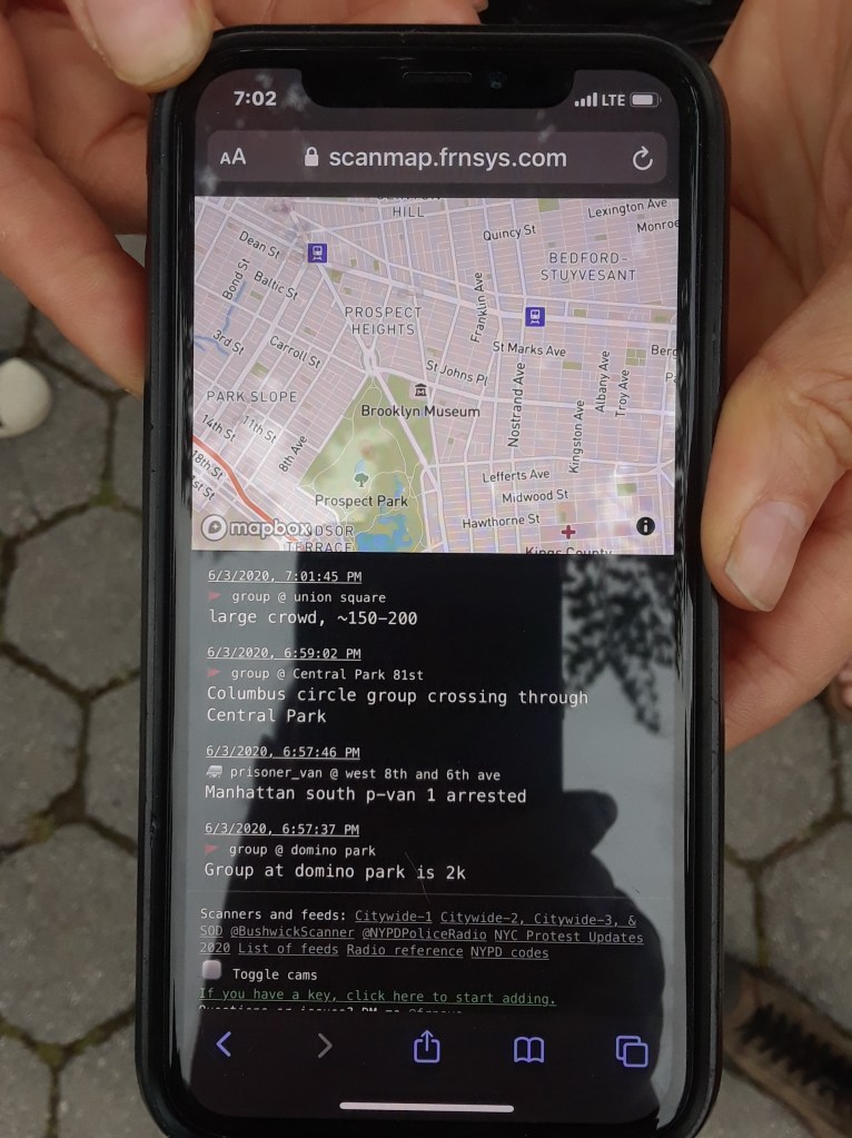 There was a peaceful demonstration/vigil for George Floyd at a park a couple of blocks away from me today, so I went and checked it out. Everyone was masked, it was fine. What struck me as interesting was I met up with a few friends and we were talking in the Park after the vigil had mostly ended, and a couple of people came up to us in a kind of weird fashion, almost like a covert op, and shared information on where the cops were, how many on each entrance to the park, and a police scanner app with updates on movements of protesters. This one chick suggested we snap a photo of her phone so we could follow.